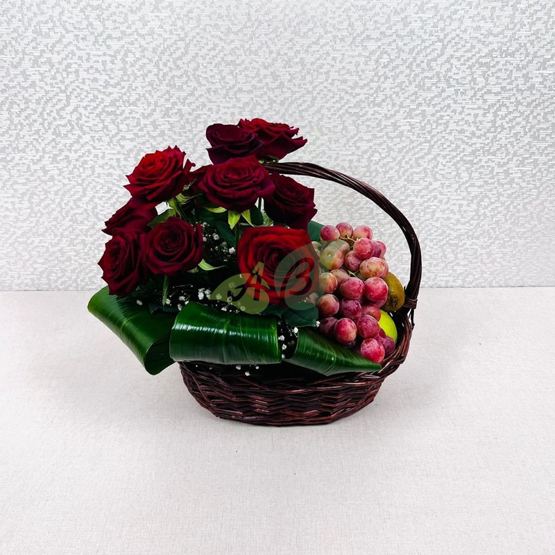 Букет из красных роз станет ярким намеком на ваши чувства или торжественность момента. Фрукты придутся кстати к праздничному столу или романтическому вечеру за столиком на двоих. Корзина украшена декоративным бантом, содержимое уложено аккуратно и плотно – набор перенесет дорогу до ресторана, а потом домой, к примеру.